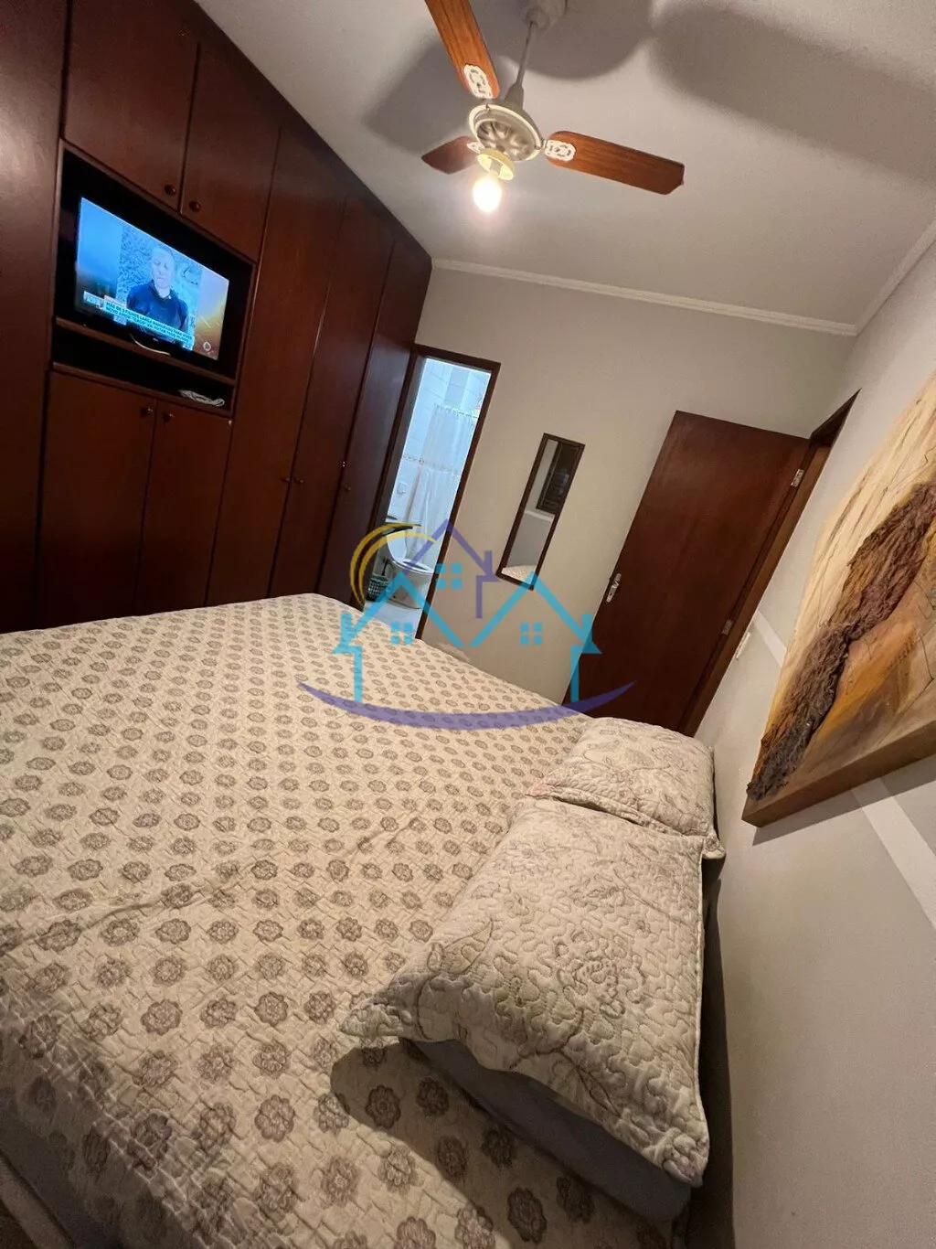 Suíte com armarios planejados e ventilador de teto