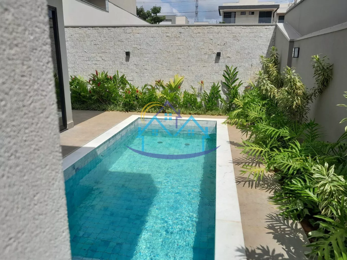 Fachada até a altura de 6m e muro de fundo da piscina revestidos em pedra Madeira Branca.