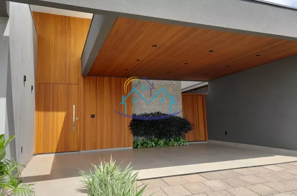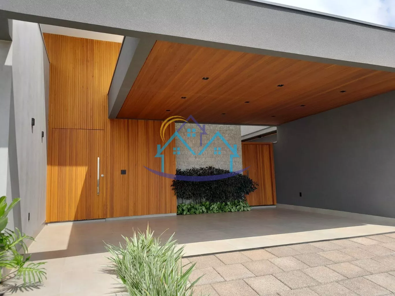Porta de entrada com ripado até a altura de 5m em madeira Cedro Rosa.