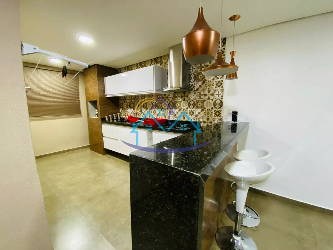 ✔ Área gourmet coberta com cooktop, churrasqueira e balcão em mármore